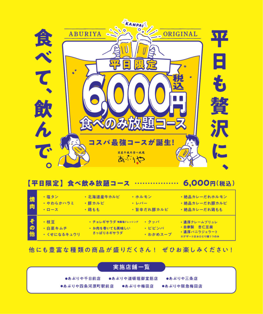 [平日限定 6,000円食べ飲み放題コース]新登場!(あぶりや一部店舗)